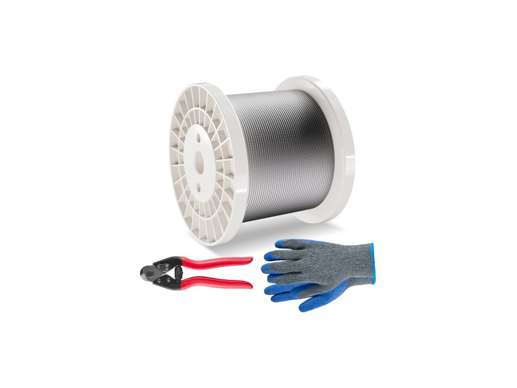 Sada ocelových lan VEVOR, 1/8" 600 ft, nerezové lano 316 s řezacími kleštěmi a rukavicemi, pevnost v tahu 1600 lbs, 7x7 pramenů, stavební, námořní, letecká kvalita pro zábradlí, schodiště, terasu, plot, venkovní použitíNerezové ocelové lano
