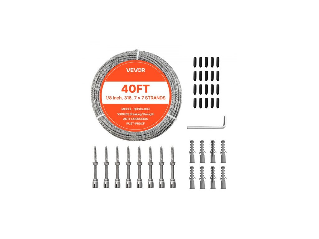 Sada ocelových lan VEVOR 3,2 mm, délka 12,2 m, lano z nerezové oceli 316, pevnost v tahu 7,1 kN, konstrukce 7 x 7 pramenů, ocelové lano pro zábradlí terasy, zahradní treláže, světelné řetězy