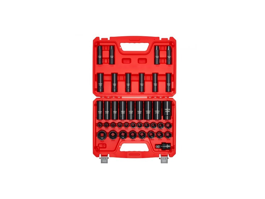 Sada rázových nástrčných klíčů VEVOR 1/2 palce Drive, 39 kusů, 6hranné hluboké a mělké rázové nástrčné klíče, metrické 9 až 30 mm, vysoce odolná chrom-vandidátová ocel, s univerzálním kloubem, dvojité značení velikostí, odolné přepravní pouzdroPřesné drážky pro objímky