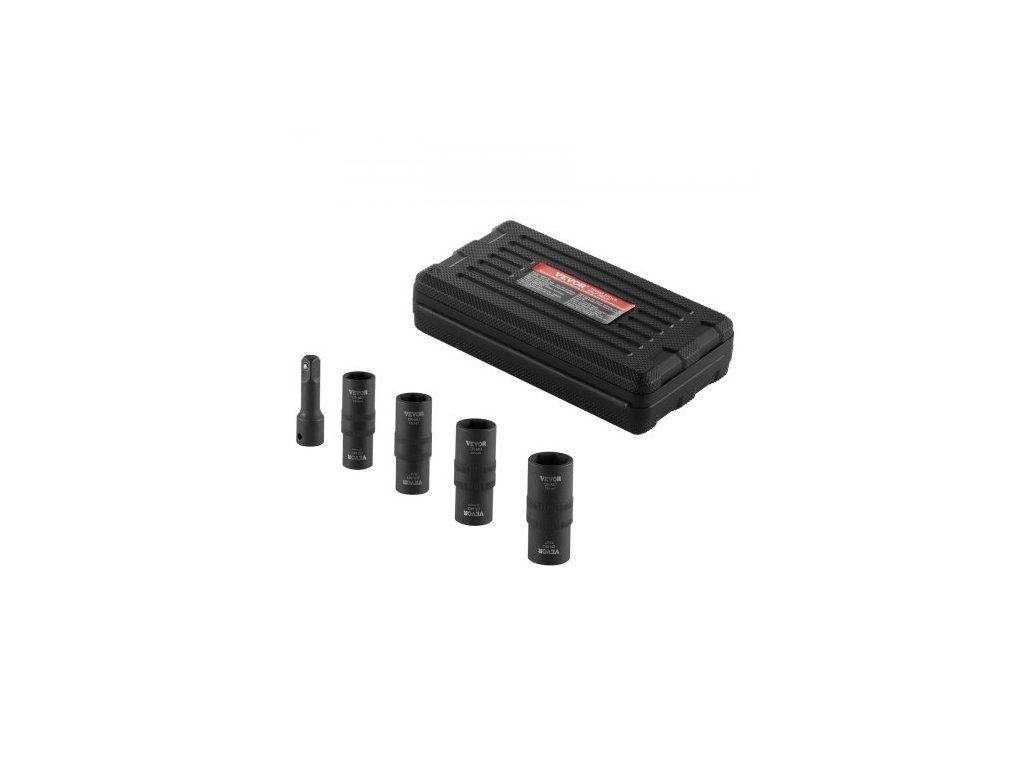 Sada rázových nástrčných klíčů VEVOR na matice kol, 1/2" metrický pohon a 6hranný výklopný nástrčný klíč SAE, celkem 4 velikosti matic kol, sada nástrčných klíčů na kola z CR-MO oceli s úložným pouzdrem a prodlužovací tyčí, pro opravy automobilů