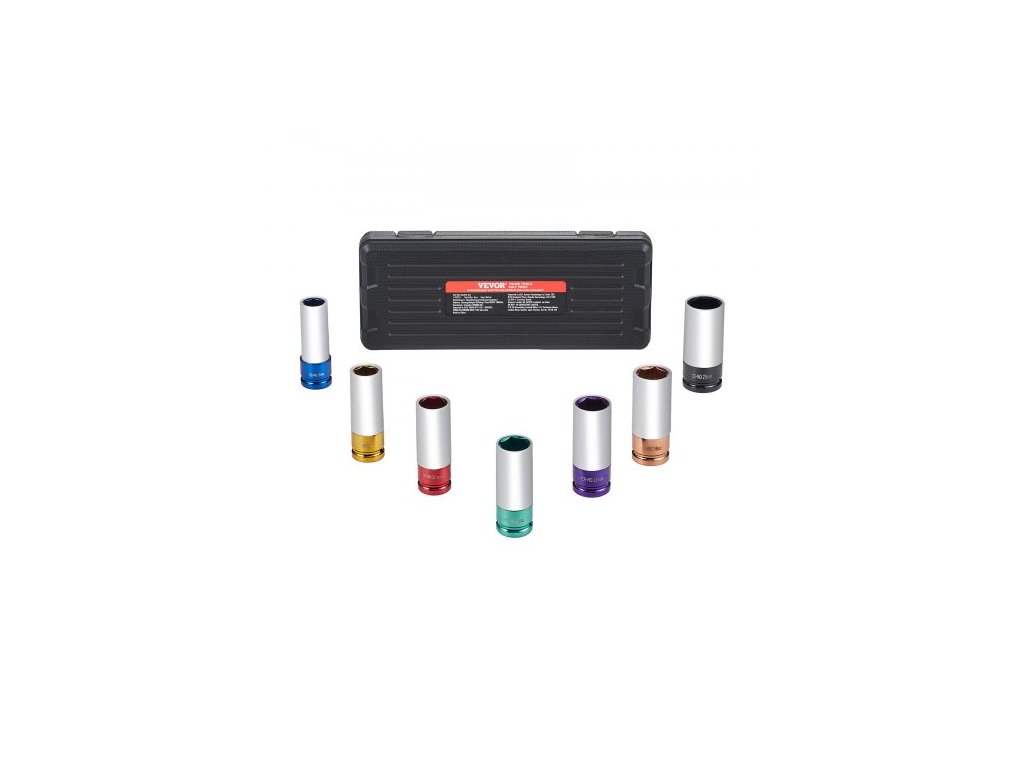 Sada rázových nástrčných klíčů VEVOR na matice kol, 1/2 palcový pohon, metrický 6hranný hluboký nástrčný klíč, celkem 7 velikostí matic kol 17/19/21/22/23/24/27 mm, sada nástrčných klíčů na kola z oceli CR-MO s úložným pouzdrem, pro opravy automobilů