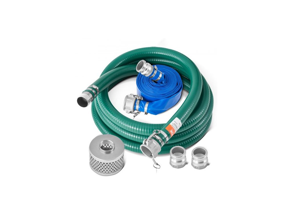 Sada sací hadice VEVOR pro vodní čerpadlo s modrou hadicí pro zpětný proplach 51 mm (2 palce) x 15,2 m (50 stop), zelenou sací hadicí 6,1 m (20 stop) a ocelovým sítkem s kulatým otvorem, zámky Camlock, svorkami, adaptérem s vačkou a drážkou, pro různé účelyKompletní sada