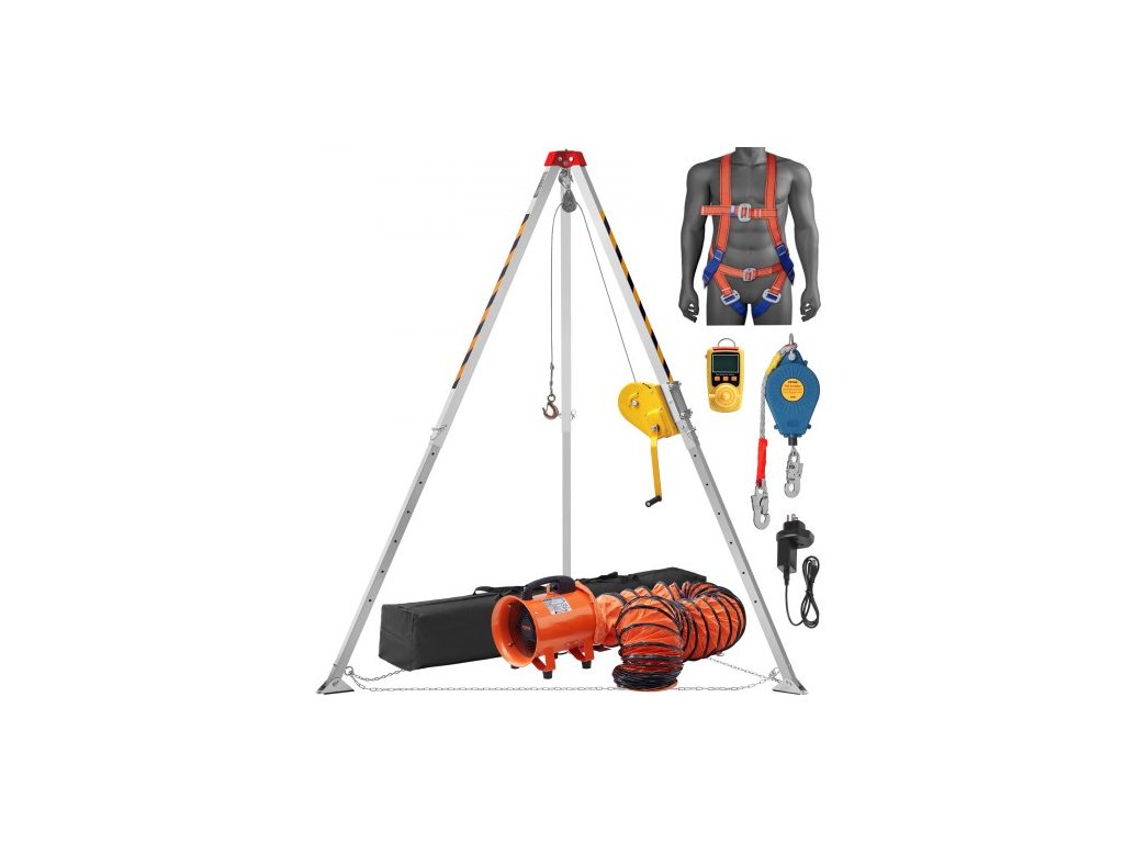 Sada stativu VEVOR pro omezený prostor, naviják 2600 lb, stativ pro omezený prostor 8' nohy a 98' kabel, stativ pro záchranu ve stísněných prostorech 32,8' ochrana proti pádu, postroj, foukač, taška pro tradiční stísněné prostoryNepřekonatelná tažná síla