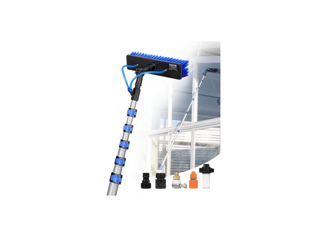 Sada tyčí VEVOR s přívodem vody, 11m čisticí tyč na solární panely s výsuvnou rukojetí, otočnou kartáčovou hlavicí o 180° a 20m hadicí, nástroj na čištění oken pro domácnost i venkovní použití pro solární panely karavanuProdloužený čisticí kartáč