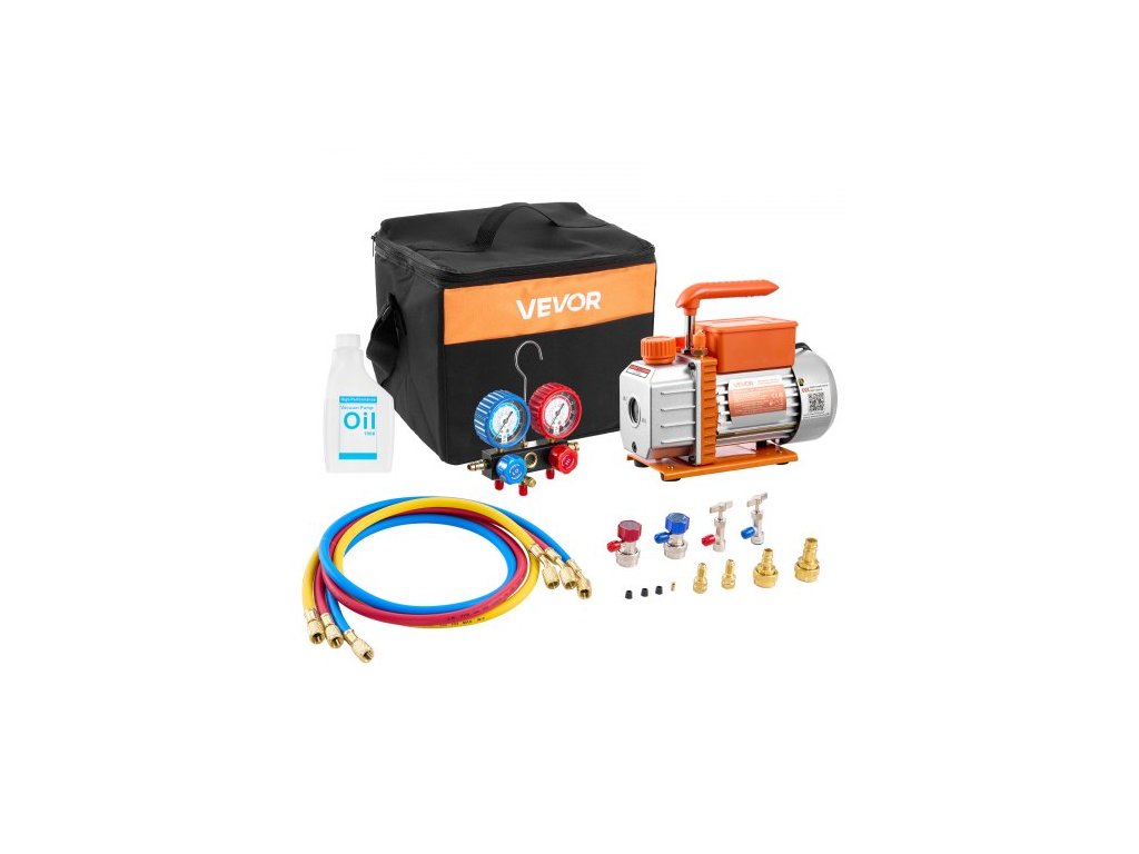 Sada vakuového čerpadla a manometru VEVOR pro klimatizaci, 3,5 CFM 99 l/min, jednostupňové rotační lopatkové vakuové čerpadlo pro HVAC, sada manometrů pro rozdělovač klimatizace, pro R134a R22 R410a R1234YF R32, s přepravní taškou, pro automatické klimatizace HVACProtiskluzová rukojeť
