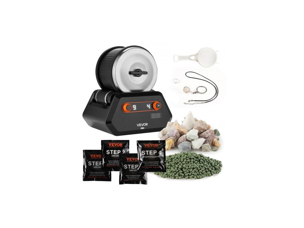 Sada VEVOR Rock Tumbler, sada na leštění kamenů, 4 nastavení rychlosti, 9denní lešticí časovač, sada na leštění kamenů, leštička kamenů s drsnými drahokamy a lešticími zrny, leštička kamenů pro dospělé a děti