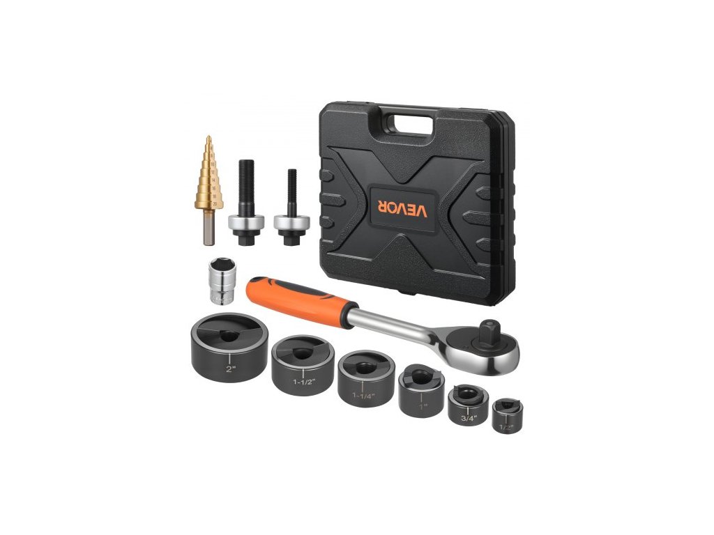 Sada vyrážečů VEVOR, sada vyrážečů s ráčnou SLUG-Buster 12,7 až 50,8 mm, sady vyrážečů s ráčnovým klíčem pro hliník, nízkouhlíkovou ocel, sklolaminát, plasty, 6 velikostí matric, sada nástrojů z oceli 40Cr Ko