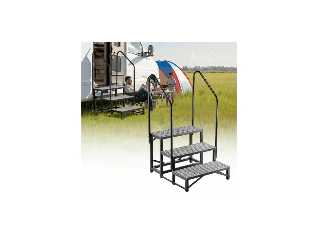 Schůdky VEVOR pro obytné vozy s dvojitým zábradlím, 3 schody, nosnost 300 kg, odolné venkovní schody pro obytné vozy s protiskluzovou podložkou pro seniory/domácí mazlíčky, přenosné schody do vířivky, obytného přívěsu, mobilního domu, verandy, bazénu, vířivkyStabilní a bezpečný