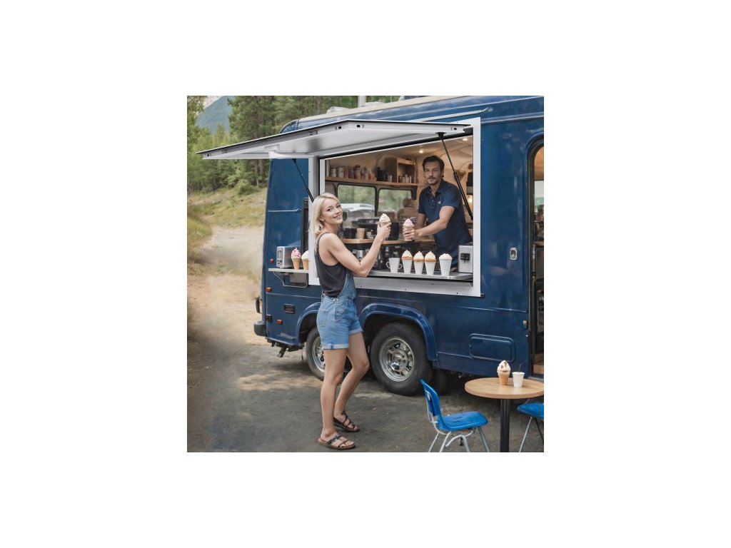 Servírovací okno VEVOR pro koncesní přívěsy s občerstvením, 91 cm x 91 cm, hliníkové slitiny, markýza a tažný háček, servírovací okno s úhlem stojanu až 85 stupňů pro koncesní přívěsy s občerstvením, sklo není součástí dodávky.