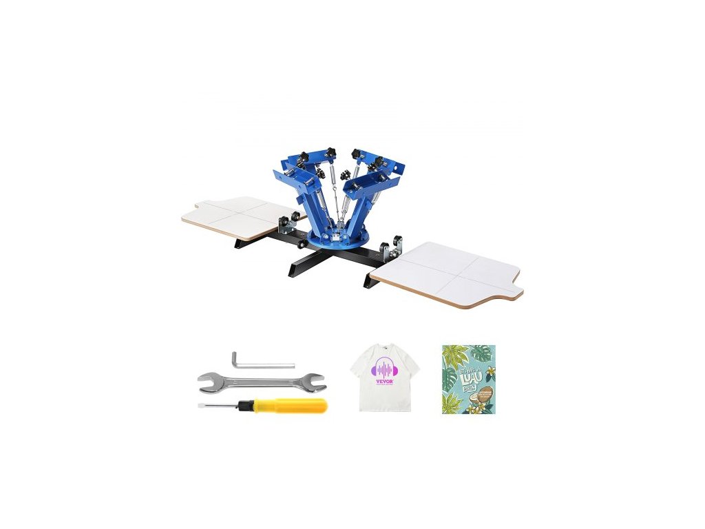 Sítotiskový stroj VEVOR, 4barevný 2-staniční otočný sítotiskový lis o 360°, sítotiskový lis 21,2x17,7 palce / 54x45 cm, dvouvrstvá polohovací paleta pro potisk tričekZdvojnásobte efektivitu umístění