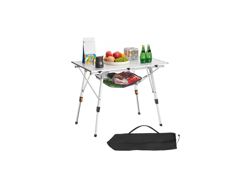 Skládací kempingový stůl VEVOR, přenosné skládací boční stolky, lehký hliníkový plážový stůl s nastavitelnou výškou, horní síťovanou vrstvou a přepravní taškou, pro venkovní grilování, piknik, cestování, stříbrný