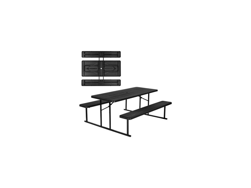 Skládací piknikový stůl VEVOR, 6 stop dlouhé skládací piknikové stoly s lavicemi, sada ocelových venkovních lavic s otvorem pro slunečník, velký venkovní jídelní stůl na terasu, zahradu, dvůr a bazén (černý)Jednoduchý a praktický design