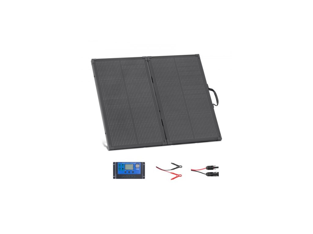 Skládací solární panel VEVOR 100W s rámem, přenosná monokrystalická nabíječka solárních panelů typu N s 16BB baterií, účinnost 24%, vodotěsnost IP67 s 30A PWM regulátorem a výstupem MC4 pro kempování, turistiku a výlety v karavanu.Vysoká účinnost konverze