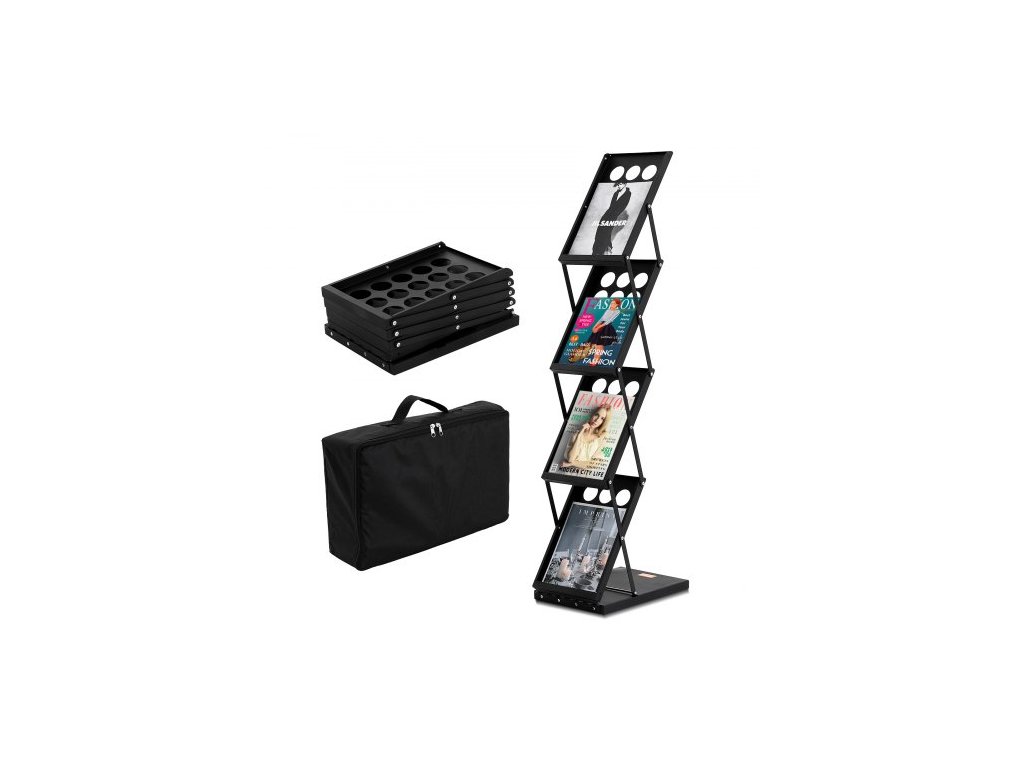 Skládací stojan na časopisy VEVOR. Stojan na brožury se 4 úrovněmi, přenosný stojan na katalogy a brožury s přepravní taškou pro kancelářské a veletrhové výstavy, 4 kapsyVysokokapacitní úložný prostor