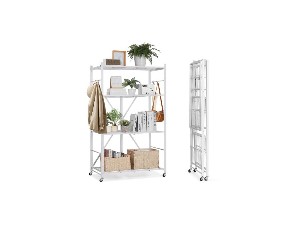 Skládací úložný regál VEVOR se 4 úrovněmi, skládací kovový regálový regál o rozměrech 91Š x 53H x 152V palců, bez montáže, s 5 kolečky a 4 háčky do spíže, kuchyně, garáže, sklepa, bílýIdeální střih