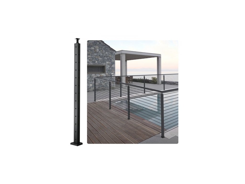 Sloupek kabelového zábradlí VEVOR, ocelový rohový sloupek zábradlí ve tvaru L o rozměrech 42" x 1" x 2", 12 předvrtaných otvorů, nerezový sloupek kabelového zábradlí SUS304 s horizontálním a zakřiveným držákem, balení po 1 ks, černýSloupek zábradlí ve tvaru L s otvorem