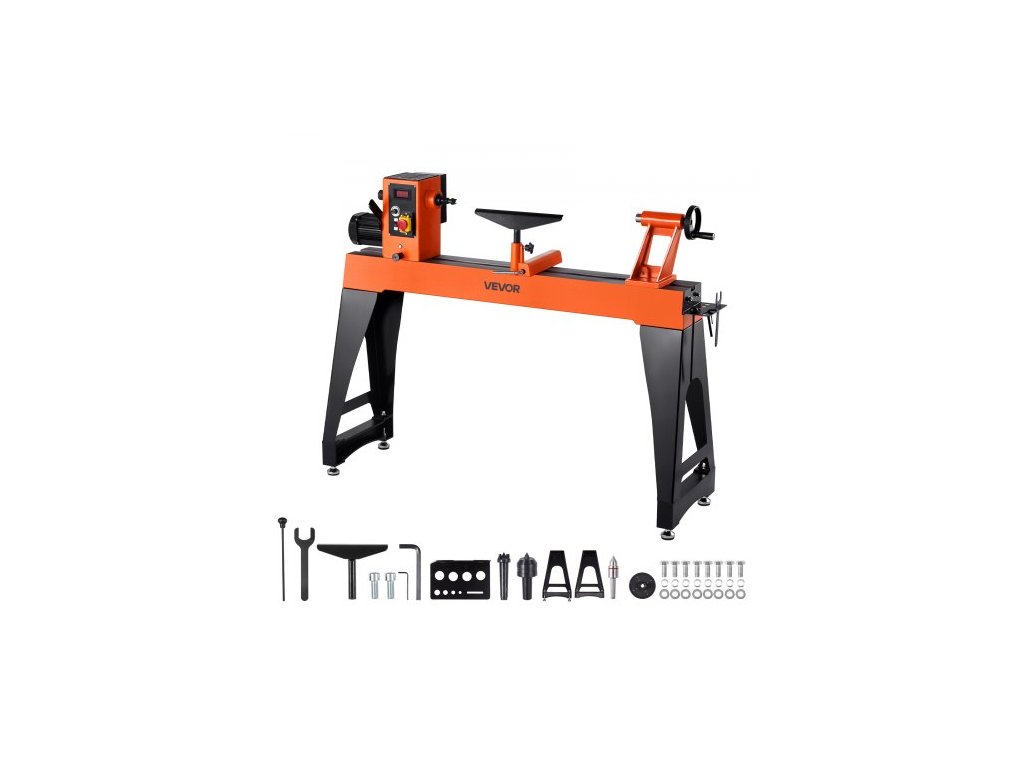 Soustruh na dřevo VEVOR, 1100 W / 1,5 HP, soustruh na dřevo s proměnnou rychlostí 0 až 3200 ot./min, pracovní stůl 406 x 1020 mm, bezkartáčový stejnosměrný motor, litinové tělo, podpěra nástroje, pro střední až velké projekty při zpracování dřeva