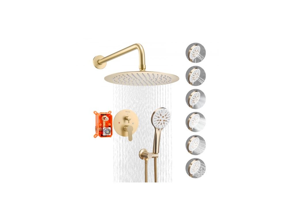 Sprchová baterie VEVOR, sprchový systém Rainfall do koupelny s kulatou sprchovou hlavicí Rain o průměru 25,4 cm a ruční sprchou, nástěnné vanové armatury s mosazným ventilem a ozdobnou sadou, kartáčované zlato