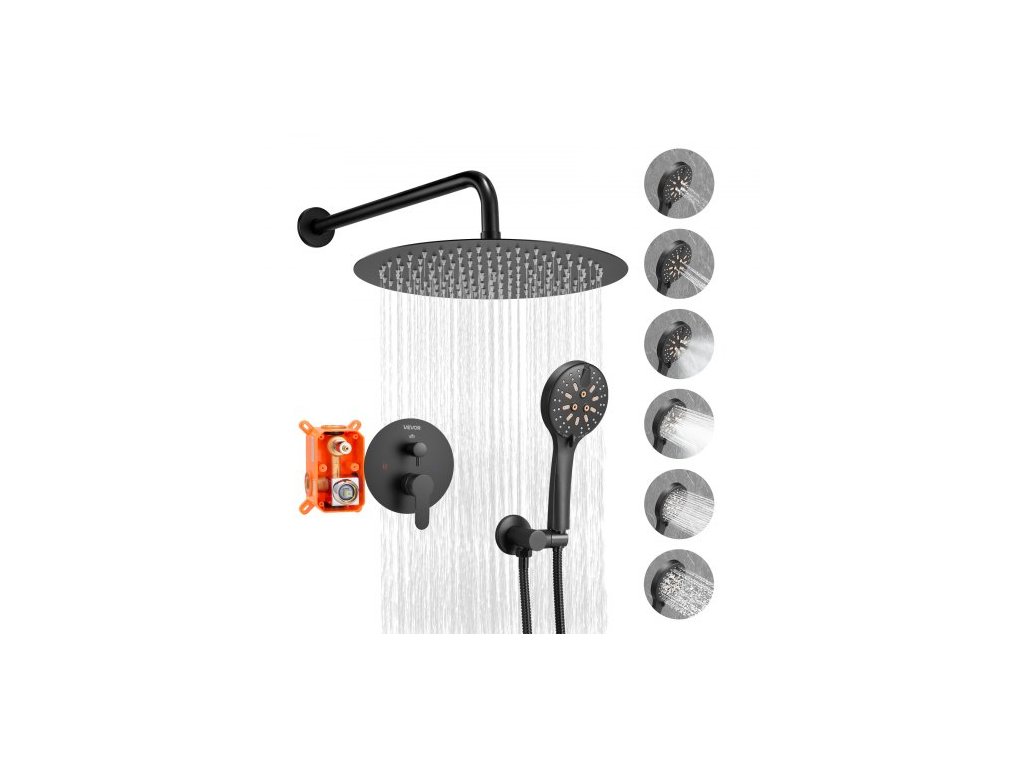 Sprchová baterie VEVOR, sprchový systém Rainfall s kulatou sprchovou hlavicí Rain o průměru 30,5 cm a ruční sprchou, nástěnné vanové armatury s mosazným ventilem a ozdobnou sadou, matně černá