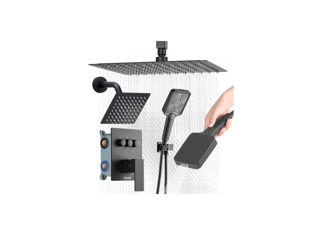 Sprchová baterie VEVOR, stropní sprchový systém Dešťová sprcha 305 mm s nástěnnou hlavicí 152 mm a ruční sprchou 4 v 1, otočná 3funkční duální dešťová hlavice, mosazný ventil a sada lemů, matně černáOtočný design