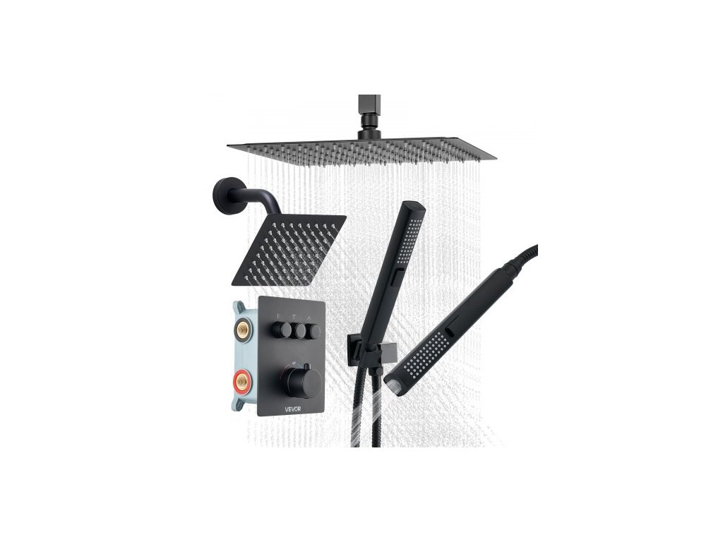 Sprchová baterie VEVOR, termostatická stropní sprchová baterie 305 mm s nástěnnou hlavicí 152 mm a ruční sprchou 2 v 1, 3funkční duální dešťová hlavice, mosazný ventil a sada armatur, matně černá