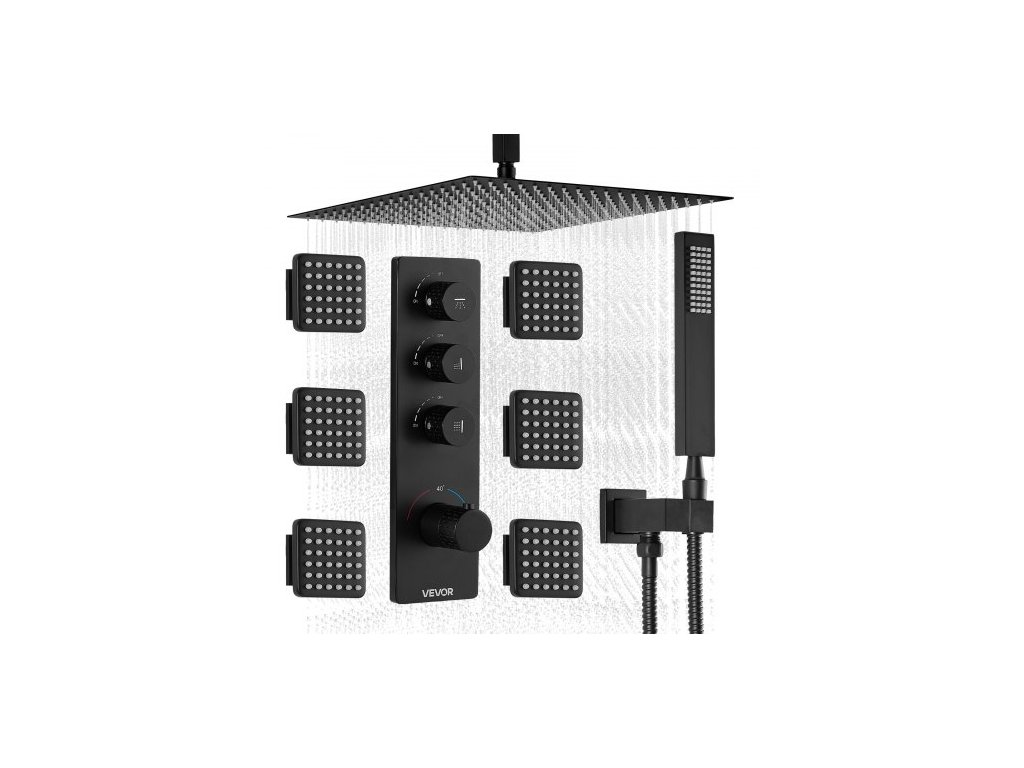 Sprchová baterie VEVOR, termostatická stropní sprchová baterie 406 mm s 6 tryskami a ruční sprchou, otočná 3funkční dešťová hlavice, kompletní mosazný ventil a sada armatura, matně černáOtočný design