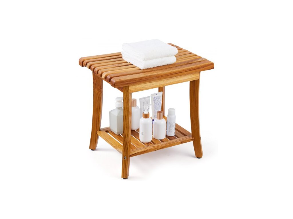 Sprchová lavice VEVOR z teakového dřeva, 20 x 14,3 x 17,9 palce, vodotěsná dřevěná sprchová stolička s úložnou policí, protiskluzové opěrky nohou, maximální nosnost sedáku sprchové židle 180 kg, pro použití v koupelně v interiéru i exteriéruDokonalý doplněk koupelny