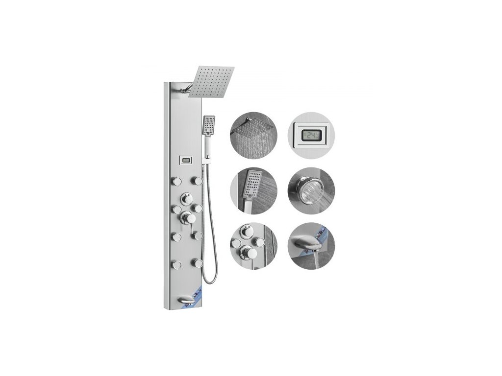 Sprchový panel VEVOR, 6 sprchových režimů, digitální displej, věžový sprchový panel, dešťová sprcha, 8 masážních trysek, výtok z vany, ruční sprchová hlavice se 3 nastaveními, hadice 59", nástěnná sprchová sada z nerezové oceliRežim horního postřiku