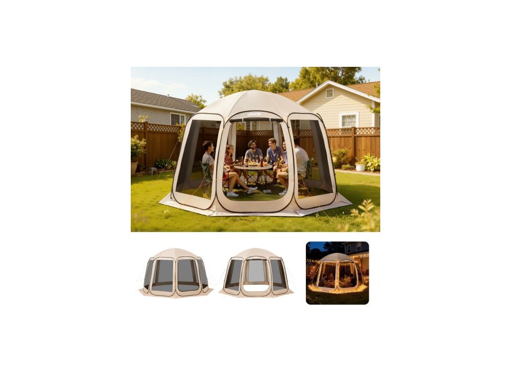 Stan VEVOR s stíněnou stěnou, 3660 x 3380 x 2300 mm, výklopný stan s stíněnou stěnou pro 10–12 osob, přenosný, se stíněnou stříškou a přepravní taškou, síťované boky, kolíky do země, pro zahradu, terasu, venkovní aktivity, béžovýStabilní horní podpěra
