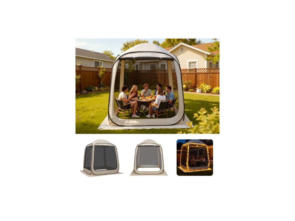 Stan VEVOR se stínící stěnou, 1825 x 1825 x 2200 mm, výklopný stan pro 4–6 osob, přenosný, se stříškou a přepravní taškou, síťované boky, kolíky do země, pro zahradu, terasu, venkovní aktivity, béžovýStabilní horní podpěra