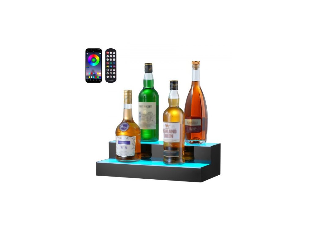 Stojan na lahve s alkoholem VEVOR s LED osvětlením, 2 úrovně 16palcového komerčního osvětleného barového regálu pro domácnost, 2stupňový stojan na whisky, akrylové police na nápoje s RF dálkovým ovládáním a ovládáním pomocí aplikace a vícebarevné osvětlení.Vícebarevné LED osvětlení