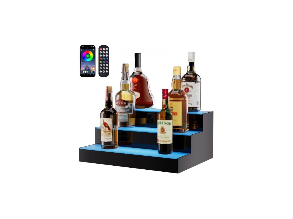 Stojan na lahve s alkoholem VEVOR s LED osvětlením, 3 úrovně 16palcového komerčního osvětleného barového regálu pro domácnost, 3stupňový stojan na whisky, akrylové police na nápoje s RF dálkovým ovládáním a ovládáním pomocí aplikace a vícebarevné osvětlení.Vícebarevné LED osvětlení