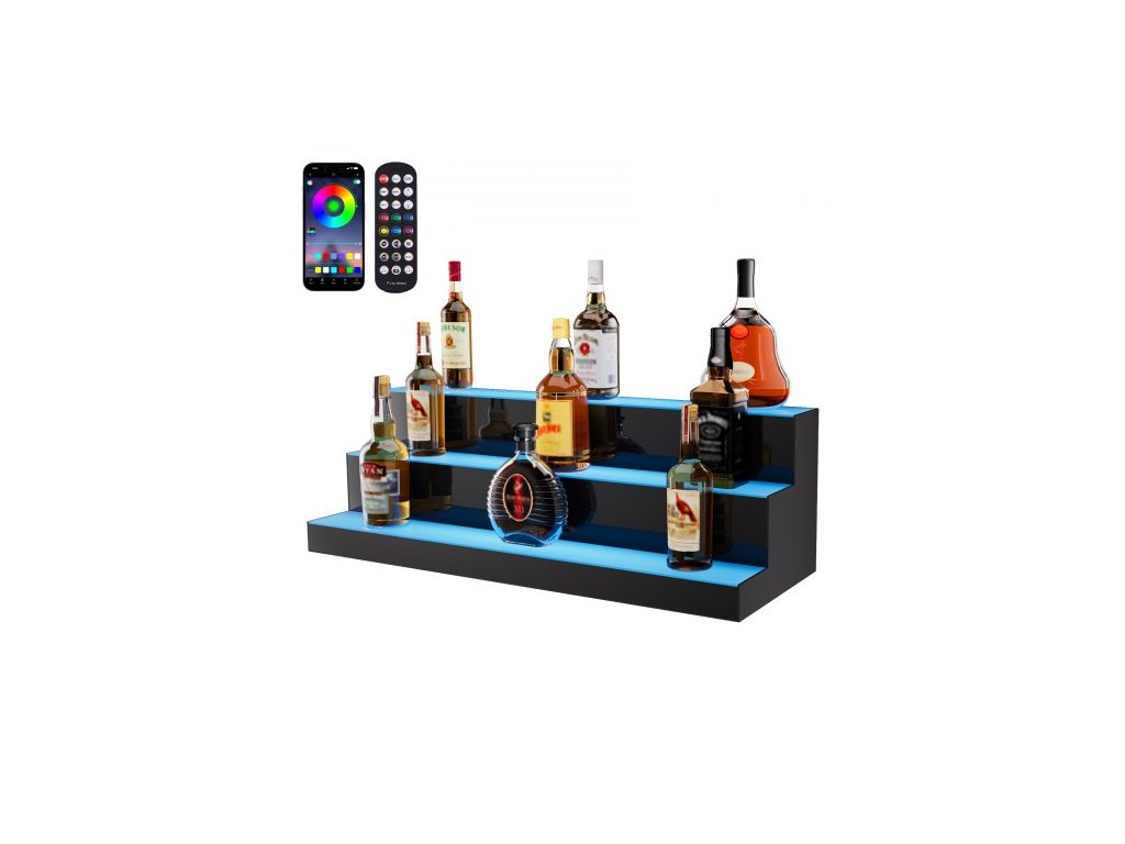 Stojan na lahve s alkoholem VEVOR s LED osvětlením, 3úrovňový 30palcový komerční osvětlený domácí barový regál, 3stupňový stojan na whisky, akrylové police na nápoje s RF dálkovým ovládáním a ovládáním pomocí aplikace a vícebarevné osvětlení.Vícebarevné LED osvětlení