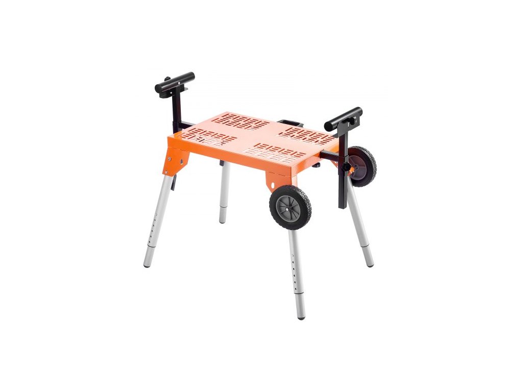 Stojan na pokosovou pilu VEVOR s deskou stolu a kolečky, nosnost 150 kg, ocelový skládací pojízdný stojan pro pokosovou pilu, nastavitelná výška a délka, přenosný kompaktní a skládací stojan na pokosovou piluVáš ideální pracovní společník