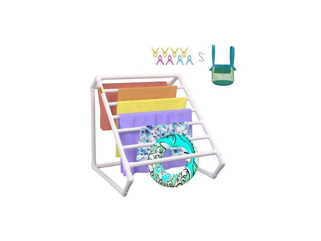 Stojan na ručníky VEVOR na bazén, 8 tyčí, bílý, volně stojící venkovní PVC trojúhelníkový úložný organizér k bazénu, včetně 8 klipů na ručníky, síťovaného vaku, háčku, také pro uložení plováků a pádel, na pláž, k bazénu