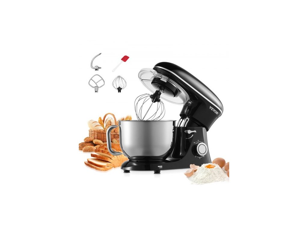 Stolní mixér VEVOR, hnětač těsta 6 QT, 1400 W, 6 rychlostí + P, kuchyňský mixér s naklápěcí hlavou, mísou z nerezové oceli, hnětacím hákem, šlehačem, plochým šlehačem, škrabkou, domácí stojan na pečení, míchání, černýOchrana proti stříkající vodě