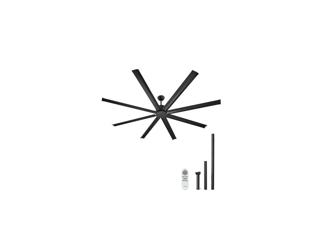 Stropní ventilátor VEVOR 213 cm bez osvětlení, 6stupňové dálkové ovládání, hliníkový 8listý, reverzibilní stejnosměrný motor, moderní nízkoprofilový zapuštěný venkovní ventilátor do ložnice, obývacího pokoje, na terasu, pro vnitřní i venkovní použití, černý3 různé velikosti spouštěcích tyčí