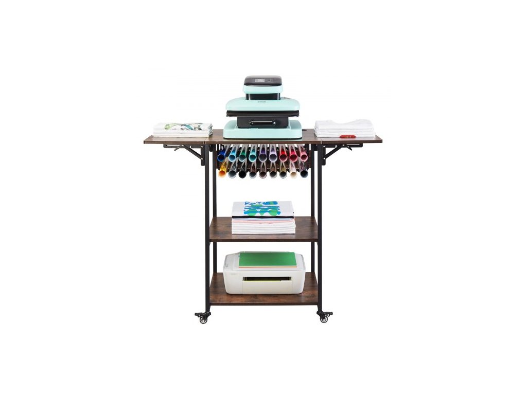 Stůl pro tepelný lis VEVOR, 3stupňový pohyblivý stojan pro tepelný lis, skládací stojan pro sublimační přenosový stroj s kolečky a držákem vinylové role, pojízdný kovový pracovní stůl pro sublimační přenosový stroj, hnědýDostatek úložného prostoru
