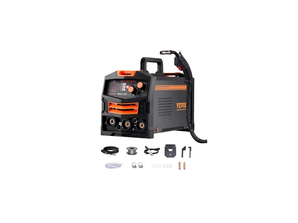 Svářečka VEVOR MIG, synergický MIG svářecí stroj 130A, 2v1 plynový MIG/bezplynový MIG multiprocesní svářecí stroj s tavidlovým jádrem, přenosný MIG svářecí stroj s invertorovou technologií IGBT a digitálním displejemVysoký svařovací výkon