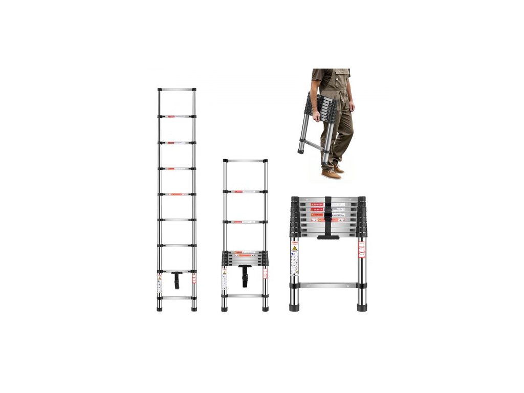 Teleskopický žebřík VEVOR, 2540mm nerezový lehký výsuvný žebřík, skládací žebřík s více tlačítky, nosnost 150 kg a protiskluzové nožičky, přenosný 9stupňový žebřík pro podkroví obytného vozu