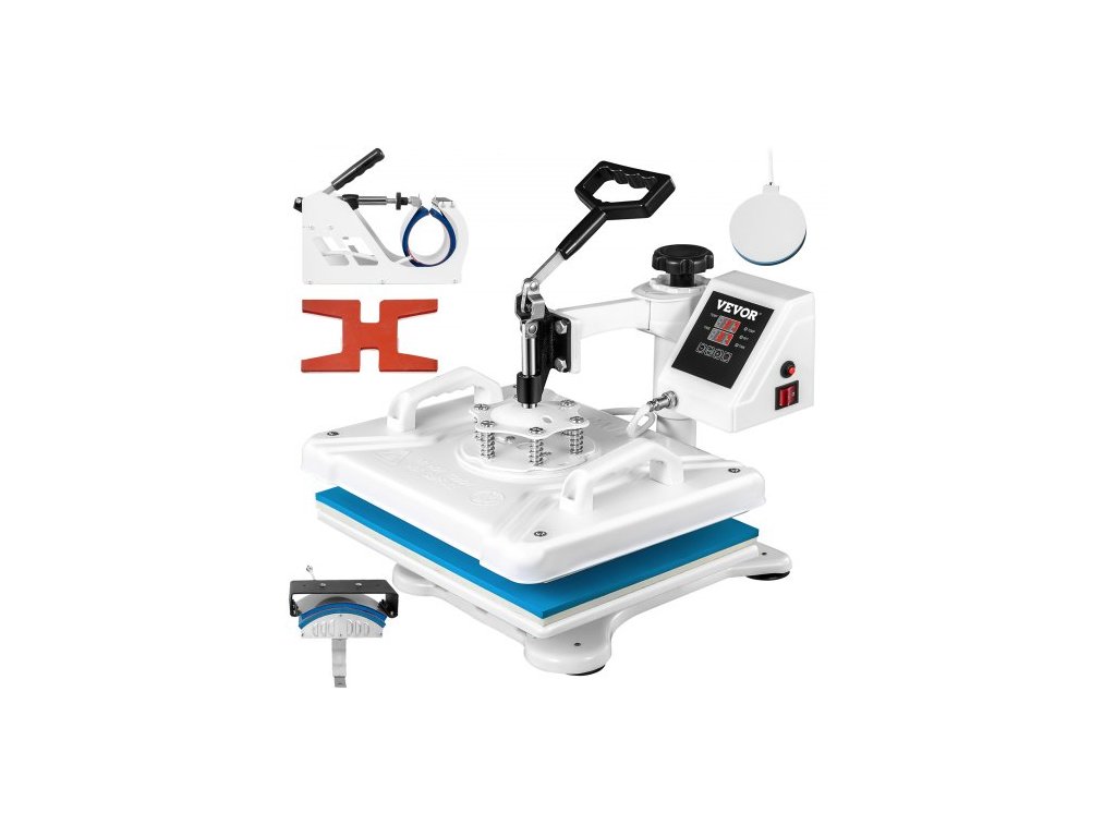 Tepelný lis VEVOR 12 X 15 palců 5 v 1 vyhřívací lis 1250 W Tepelný lis odklopný Bílý tepelný lis Sublimační tisk triček Přenos 360 stupňů pro domácí obuv Klobouk a tričkaLCD digitální displej