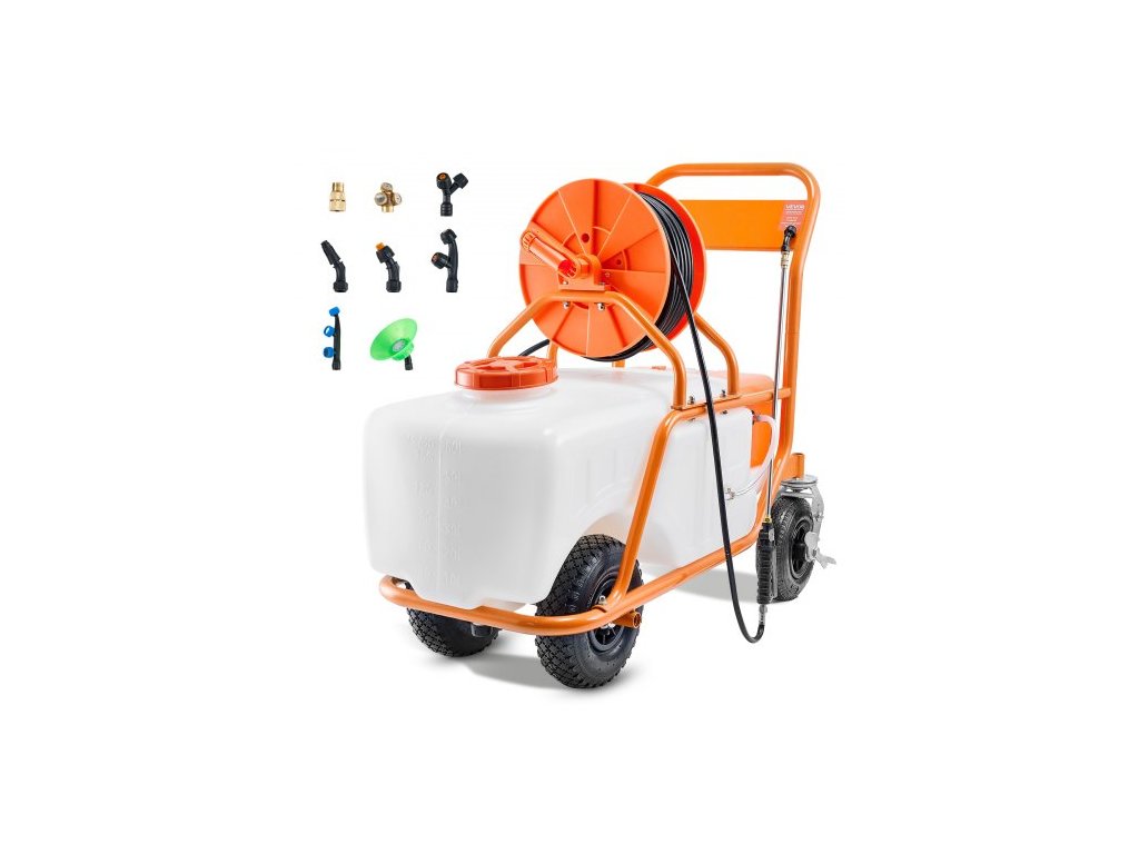 Trávníkový postřikovač VEVOR s kolečky, nastavitelný tlak 0-90 PSI, postřikovač s nádrží o objemu 60 l, s 8 tryskami, 2 tyčemi, širokým otevíráním víka pro zahradu, pletí, postřikováníVysoce účinné postřikování