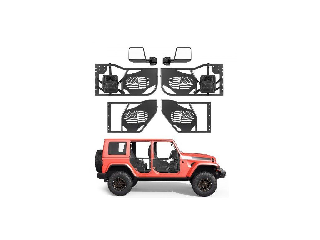 Trubkové dveře VEVOR pro Jeep, 4dveřové, kompatibilní s vozy Jeep Wrangler JK Unlimited 2007-2018, ocelové terénní přední a zadní trubkové poloviční dveře s bočními zrcátky s certifikací DOT, úložným prostorem a gumovými podložkami.