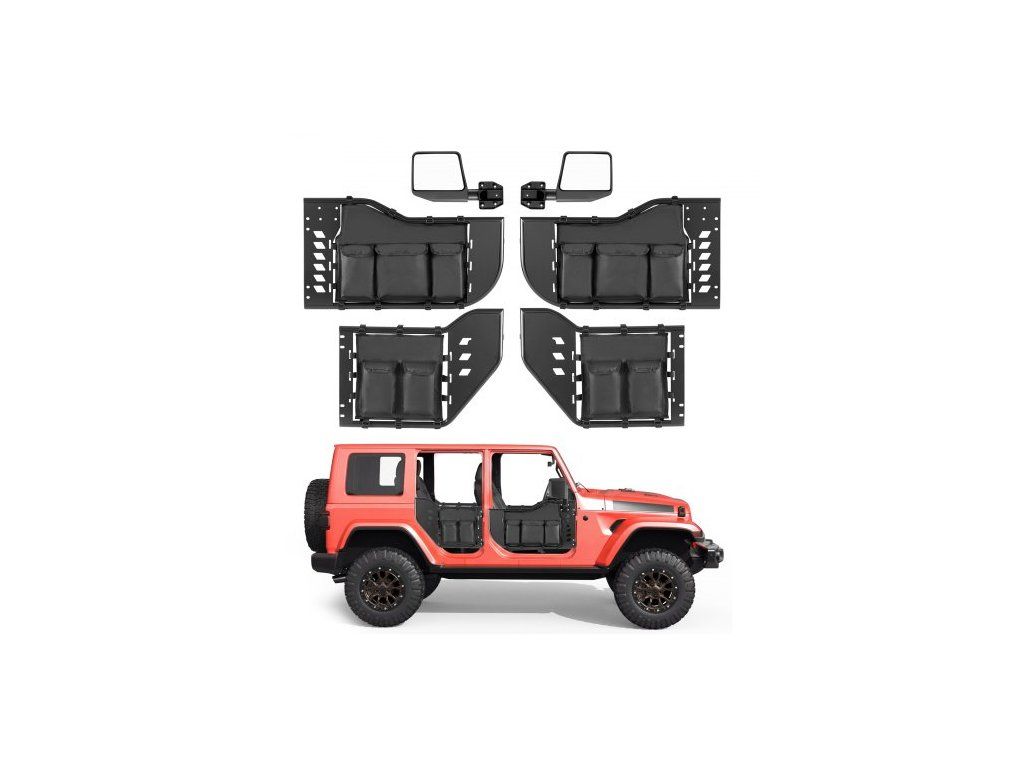 Trubkové dveře VEVOR pro Jeep, 4dveřové, kompatibilní s vozy Jeep Wrangler JL 2018-2026 a Gladiator JT 2020-2026, ocelové terénní přední a zadní trubkové poloviční dveře s bočními zrcátky s certifikací DOT a úložným vakem.