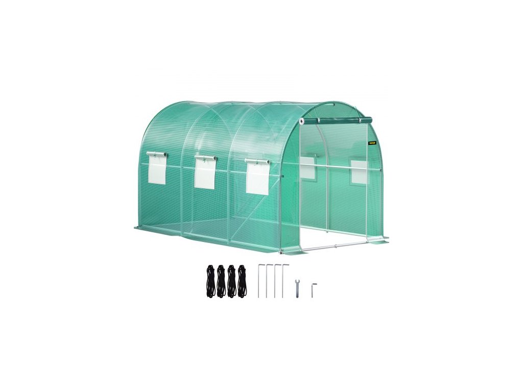 Tunelová skleníková hala VEVOR, 3,6 x 2 x 2 m / 12 x 7 x 7 stop, přenosná skleníková hala s pozinkovanými ocelovými obručemi, 1 horním nosníkem, 2 diagonálními tyčemi, 2 dveřmi na zip a 6 rolovacími okny, zelená