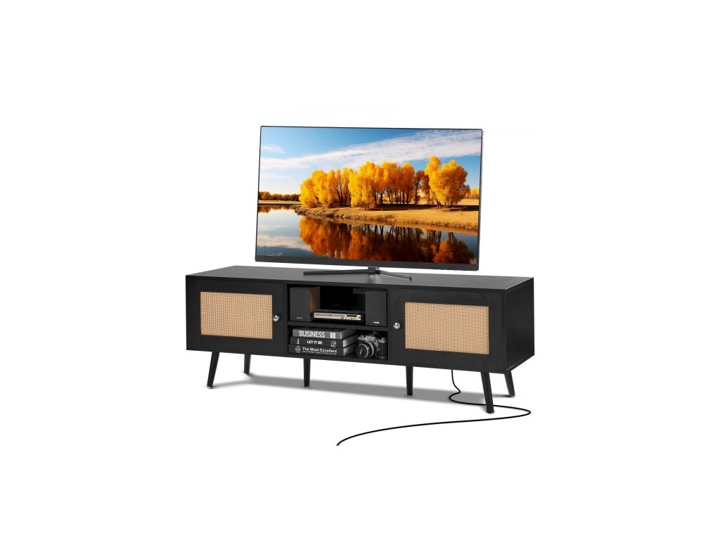 TV stolek VEVOR z ratanu pro 65palcovou televizi, boho TV stolek s ratanovými dvířky, zábavní centrum s vestavěnou zásuvkou a USB porty, moderní TV konzole do obývacího pokoje, mediální místnost, černá