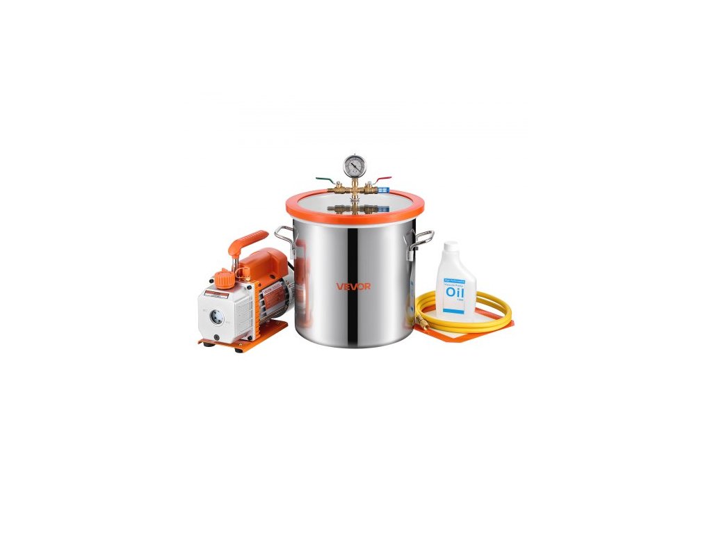 Vakuová komora VEVOR 11,36 l s čerpadlem, 3,5 CFM 99 l/min, jednostupňové vakuové čerpadlo, sada odplyňovací komory z nerezové oceli, víko z tvrzeného skla, hadice 1,5 m, pro stabilizaci dřeva, odplyňování silikonovou pryskyřicí