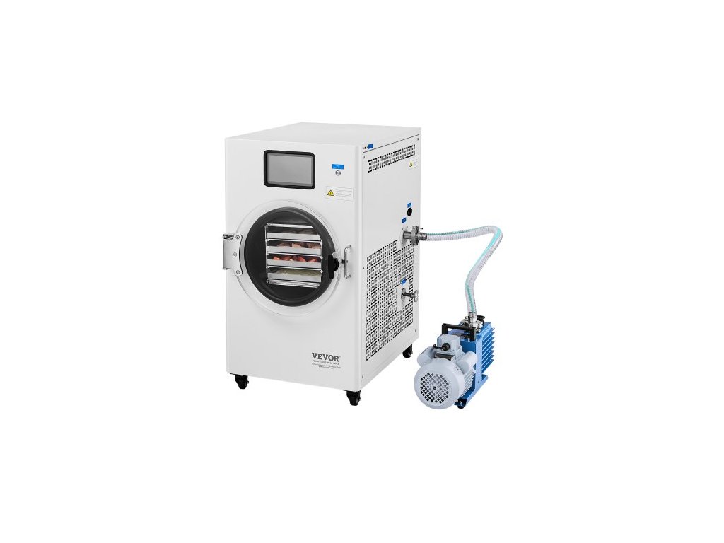 Vakuový lyofilizační stroj VEVOR, 8,8-13,2 LBS/dávka, lyofilizační stroj na potraviny se 4vrstvými tácy, vakuové čerpadlo, nastavitelný časovač a regulace teploty, pro ovoce, zeleninu a maso, bílý