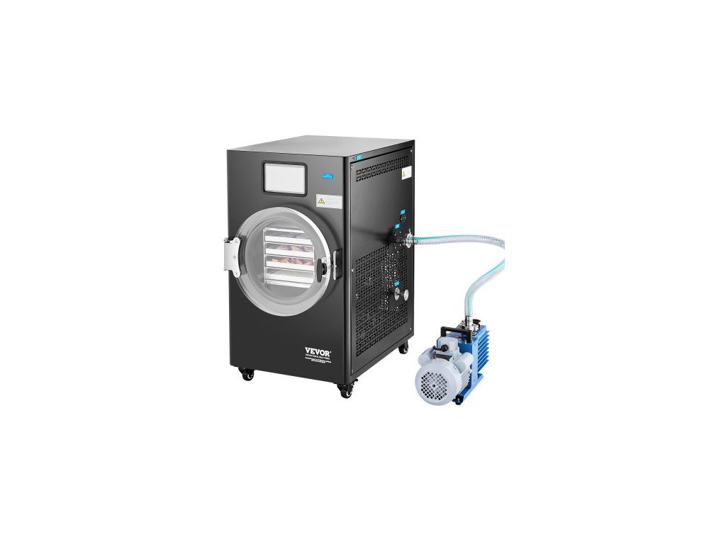 Vakuový lyofilizační stroj VEVOR, 8,8-13,2 LBS/dávka, lyofilizační stroj na potraviny se 4vrstvými tácy, vakuové čerpadlo, nastavitelný časovač a regulace teploty, pro ovoce, zeleninu a maso, černýEfektivní lyofilizace