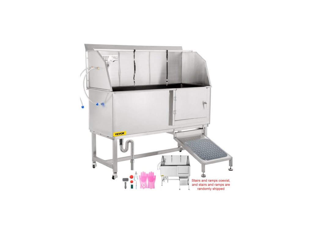 Vana na stříhání psů VEVOR, 62" R mycí stanice pro domácí mazlíčky, vana z nerezové oceli 304 s nosností 661 liber, protiskluzová mycí stanice pro psy, dodává se s rampou, kohoutkem, rozprašovačem a sadou pro odtok